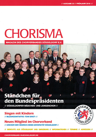 Außerdem geben wir zweimal im Jahr das Verbandsmagazin CHORISMA heraus, in dem sich unsere Chöre darstellen können, aber auch interessante Informationen verbreitet werden. Es ist ein Magazin für alle, die am Chorsingen interessiert sind – egal, ob sie bei uns Mitglied sind oder nicht. Darin ist auch ein Verzeichnis aller Mitgliedschöre. Vielleicht haben Sie ja Lust bei einem Chor in Ihrer Nähe mitzusingen. Schauen Sie einfach mal herein. Auch auf unserer Homepage können Sie sich gerne informieren und uns per Post, per Mail oder telefonisch ansprechen. Wir sind für Sie da! Auch über Facebook werden Informationen gepostet.